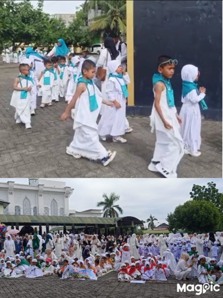 Anak anak peserta manasik haji terlihat berseragam menggunakan baju berwarna putih mirip pakaian ihram saat ibadah haji