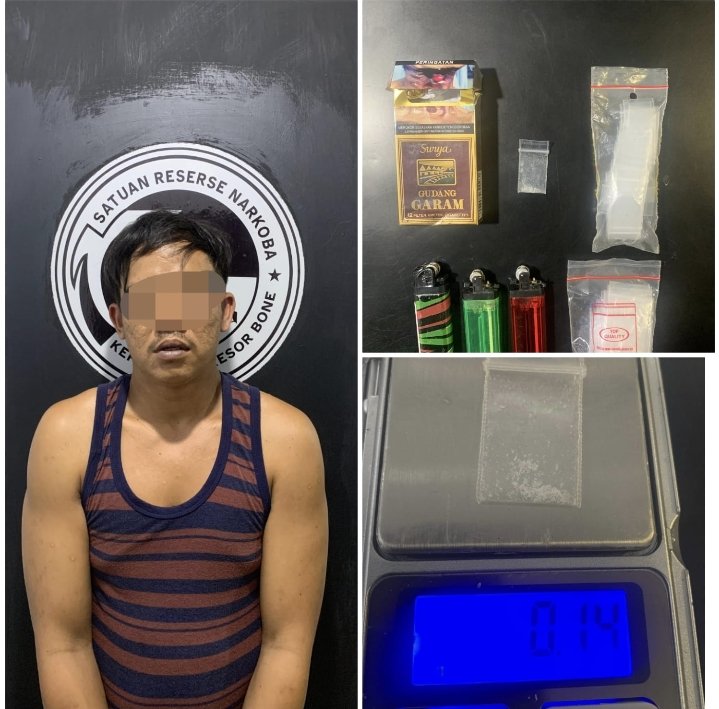 Plt Kasat Resnarkoba Polres Bone Ipda Andi Syarifuddin, SH melaporkan, petugas menemukan terduga pelaku tengah memiliki dan menguasai narkotika jenis sabu sebanyak satu paket yang tersimpan dalam bungkus rokok merek Surya di bawah bale bambu.