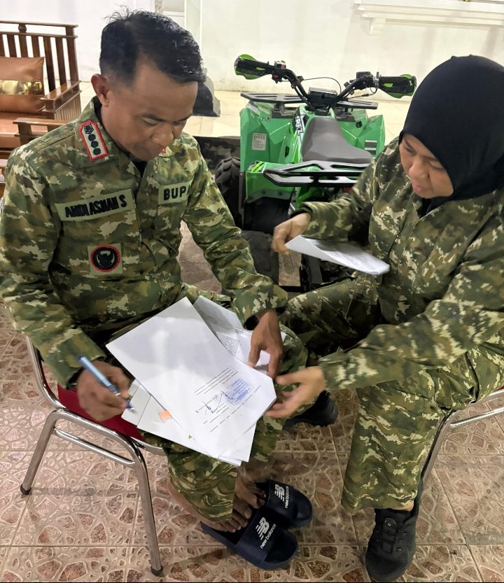 Bupati Bone Andi Asman Sulaiman resmi menandatangani Peraturan Bupati (Perbup) tentang teknis pemberian THR dan Gaji Ketiga Belas yang diantarkan langsung oleh Kepala Badan Keuangan dan Aset Daerah (BKAD) Bone Andi Tenriawaru di Rumah Jabatan Bupati Bone, Kota Watampone, Jumat (13/3/2026).